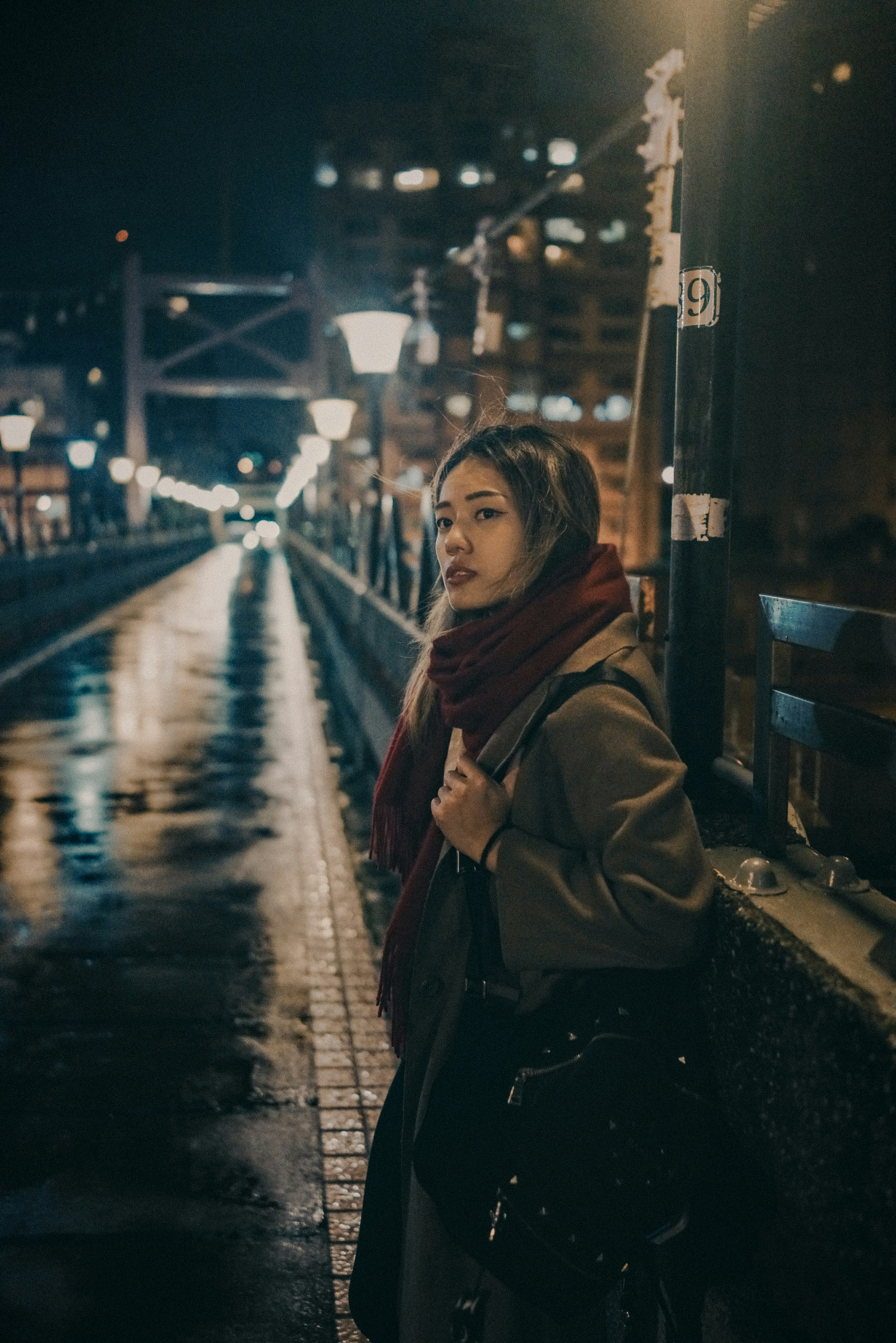 When the dark glaze is finished you can use thick white paint to put in the bright lights that are dotted around the scene. There are also some reflections on the road and in the metalwork of the bridge.
